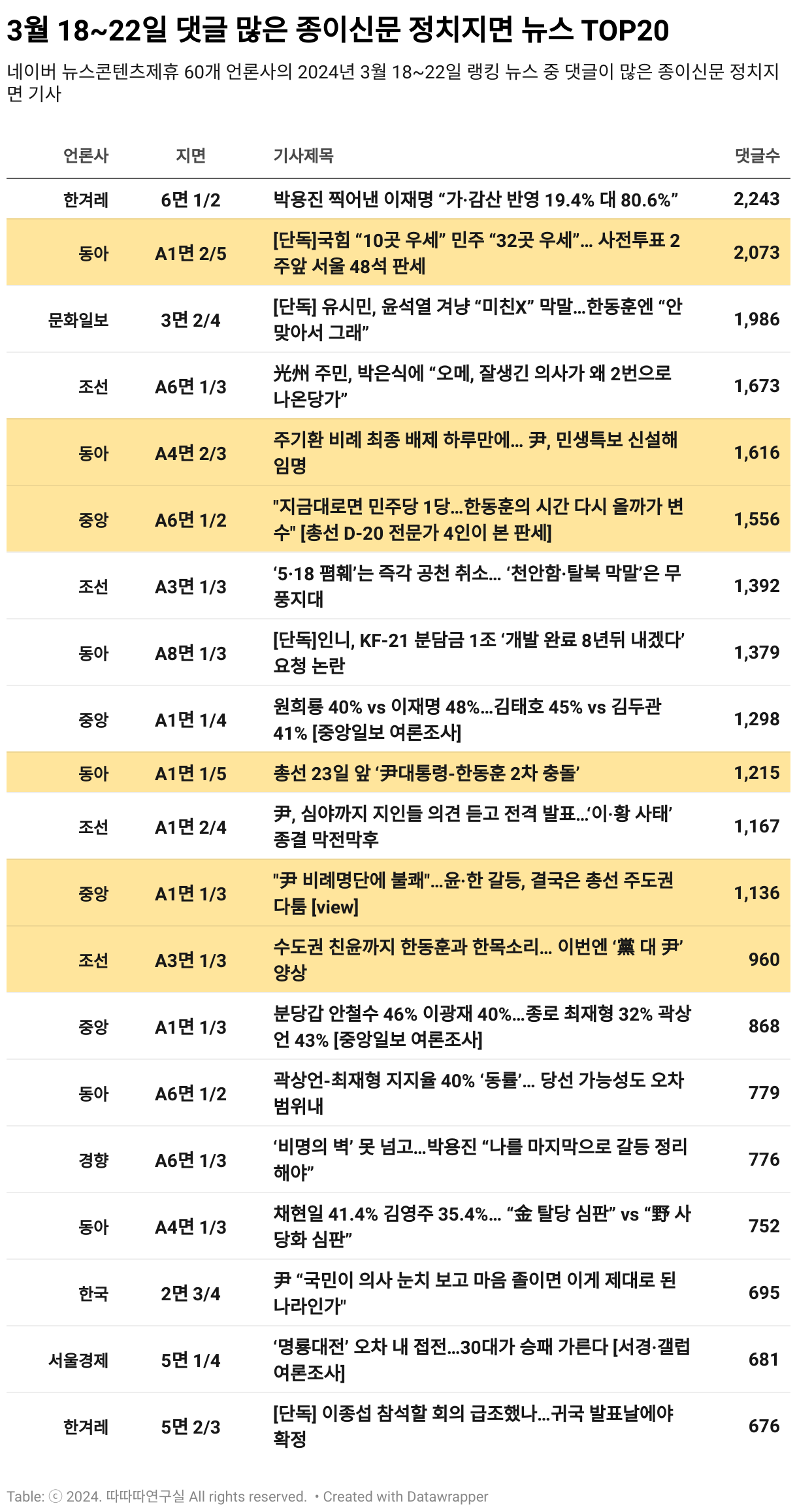 18~20일 종이신문 정치지면 뉴스 중 댓글 많은 기사 20건을 추려본 결과 정부 여당의 충돌이 부각되는 것에 대한 우려와 불안감을 보인 보도가 많았다. 지면에서 주목 받은 기사는 ‘후보 지지율 여론조사 관련 보도’와 ‘이재명 대표와 민주당 헐뜯기 보도’, ‘이종섭 황상무 사태로 인한 尹-韓 갈등’, 그리고 ‘다급하고 초조함이 느껴지는 국힘 관련 보도’로 추려볼 수 있다.