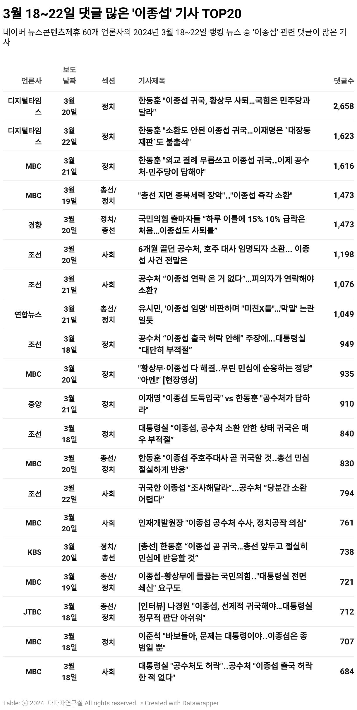지난 주 네이버 콘텐츠제휴 60개 언론사 랭킹뉴스 총 7040건 중 ‘이종섭’을 호출한 기사 제목은 400건이 넘었다. 주초에 윤대통령은 이종섭 씨 귀국이 부적절하다면서 발끈했다. 한동훈 위원장은 총선 민심에 절실하다며 대립각을 세웠다. 댓글 많은 기사의 주어 대부분은 ‘한동훈’이었지만 화제가 된 쪽은 아이러니하게도 윤대통령이었다. 게다가 한 위원장이 이재명 대표와 민주당, 공수처에 답하라고 사족을 달면서 이종섭게이트 책임론에 진정성을 느끼기 어려웠다. ‘尹-韓충돌’을 두고 한때 아름다운 시절을 보냈던 파트너 이준석 대표도 한마디 거들었다. “바보들아, 문제는 대통령이야…이종섭은 종범일 뿐”(3월 18일 MBC 보도).