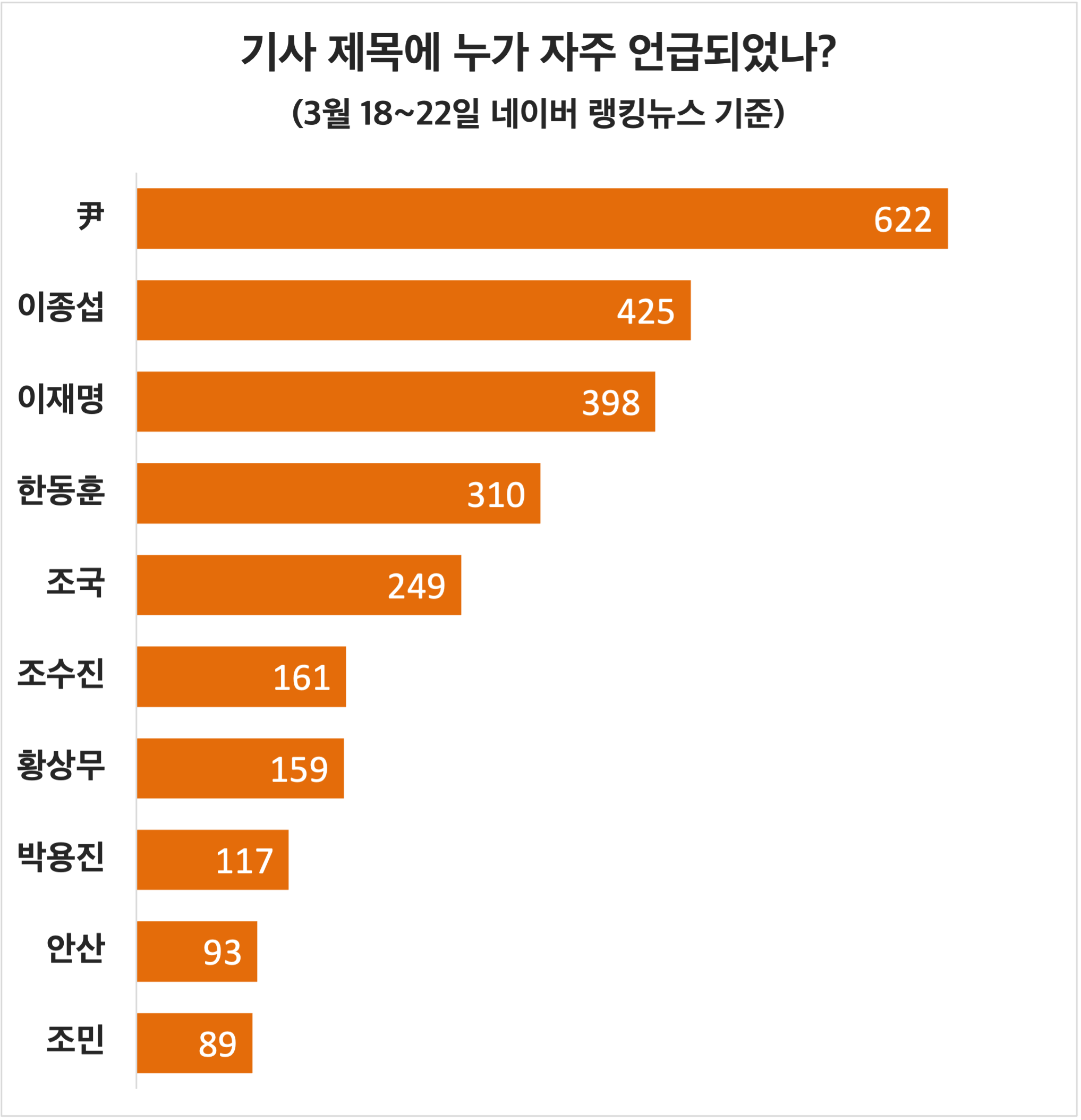 3월 18~22일까지 5일간 네이버 제휴 60개 언론사 랭킹뉴스 제목에 많이 등장한 10명을 추려본 결과 윤석열 대통령이 622번으로 빈도수 1위였다(다수 기사에서처럼 尹으로 표기). 그 다음으로 이종섭 전 장관이 기사제목에 425번 언급되어 지난 주 화제의 중심이 윤대통령과 이종섭 전 장관에 집중적으로 쏠렸음을 알 수 있다.