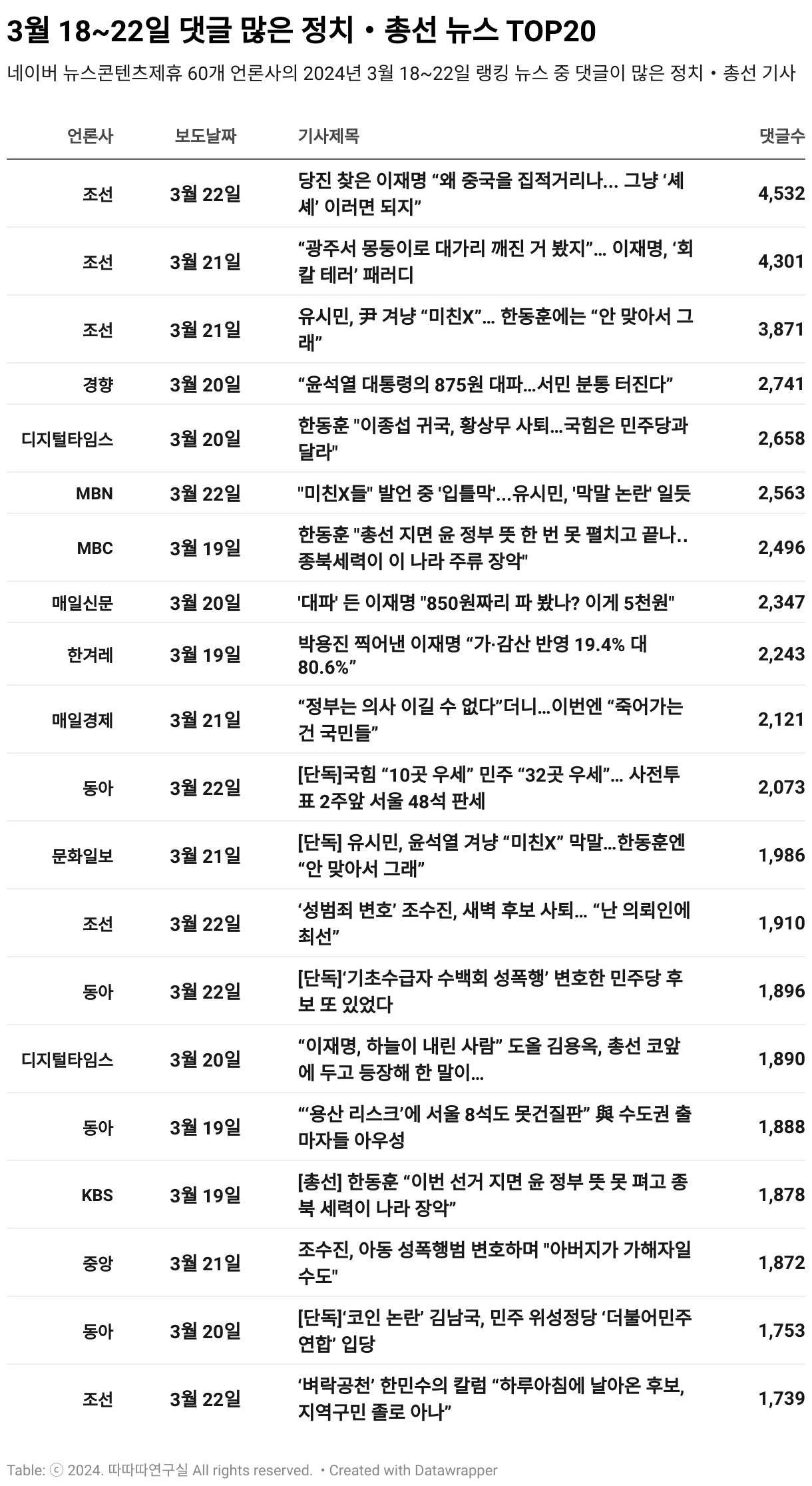 네이버 뉴스콘텐츠제휴 60개 언론사의 2024년 3월 18~22일 랭킹 뉴스 중 댓글이 쏠렸던 정치・총선 기사 20건을 분석한 결과 조선일보 5건, 동아일보 4건, 디지털타임스 2건, 경향신문 1건, 매일경제 1건, 매일신문 1건, 문화일보 1건, 중앙일보 1건, 한겨레신문1건, MBN 1건, MBC 1건, KBS 1건 등이었다.