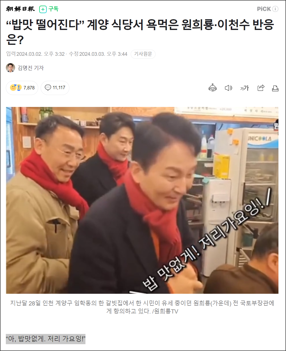 기사 확인 결과는 충격이었다. 기사 본문은 다음의 사진을 활용해 “아, 밥맛없게. 저리 가요잉!”으로 시작하고 있었다. 조선일보는 이 작은 사투리 자막을 놓치지 않고 기사 제일 앞부분에 배치했다.