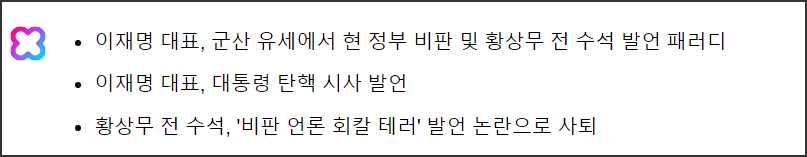 클로버 X는 첫번째 기사 제목으로<제 1야당 대표의 중국-대만 양안문제 관련 발언에 대한 논란>과 <이재명 대표의 중국-대만 양안문제 관련 발언 논란>을 제안해주었다. 두 번째 기사도 같은 방법으로 요청한 결과 <이재명 대표, 군산 유세에서 현 정부 비판 및 황상무 전 수석 발언 패러디> 등 아래 갈무리 화면과 같이 세 가지 기사 제목이 추출되었다.