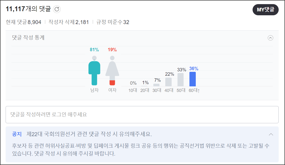이 기사에 누가 댓글을 많이 작성했는지 네이버뉴스가 제공하는 댓글 작성 통계를 확인해보았다. 그 결과 남자가 81%였고, 연령대로는 60대 36%, 50대 33%, 40대가 22%였다. 댓글 게시판에는 고정 공지글로 댓글 작성 유의 사항을 안내하고 있지만, 소용없었다. 댓글 신고탭엔 “혐오와 차별적 표현”,”불쾌한 표현”을 신고하게 되어 있지만 이 댓글은 버젓이 살아 있다. 지워지 않은 걸 보면 네이버는 이러한 지역차별 혐오표현은 표현의 자유라고 여기는 것 같다.
