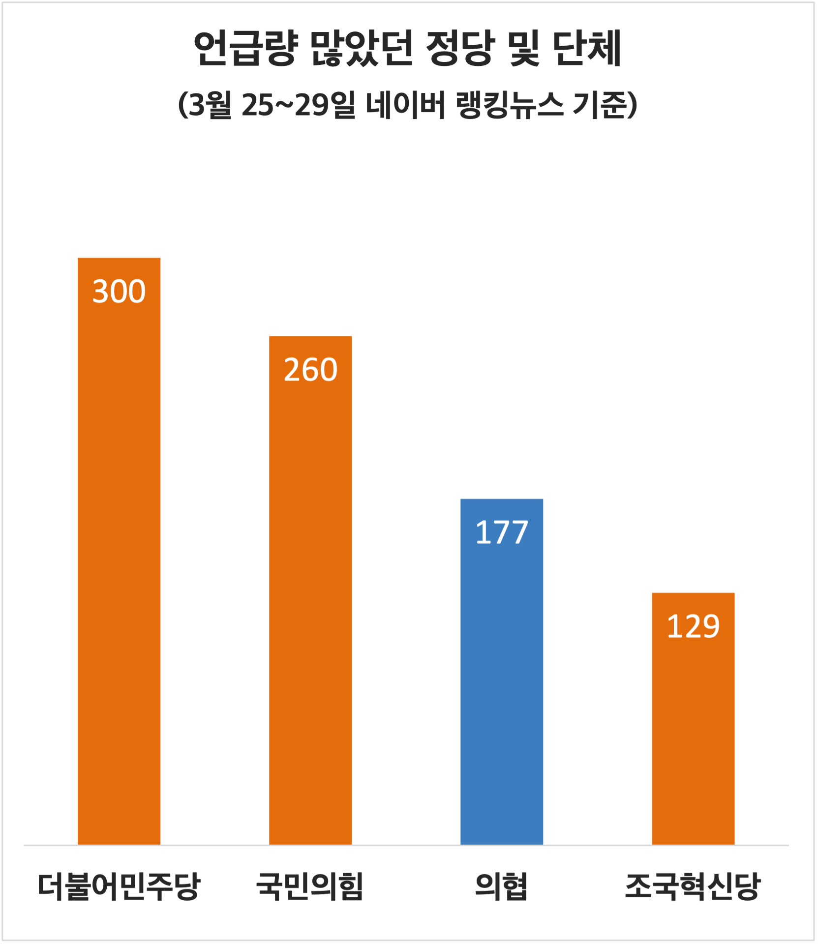 네이버 전체 랭킹뉴스 기사 제목에서 가장 많이 언급된 단체를 확인한 결과 정당은 더불어민주당(300), 국민의힘(260), 조국혁신당(129) 순이 었다. 그 가운데 의협은 177번이나 거론되었다. 긴급 현안의 핵심 단체임을 확인할 수 있다. ‘의대 정원’ 이슈는 대부분 사회 섹션에 분류되기 때문에 정치 총선 기사에서는 좀처럼 찾기 어렵다. 전체 랭킹뉴스에서 제목에 ‘의대’ 키워드가 포함된 기사는 432건이나 되었다.