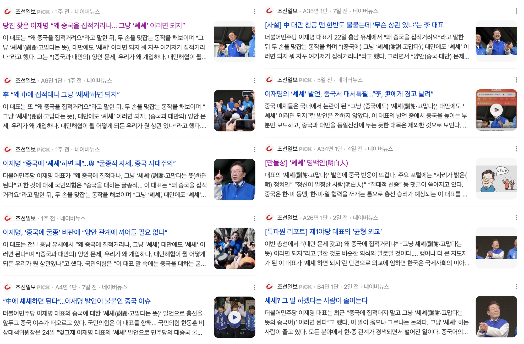 3월 25~29일 사이 네이버 랭킹뉴스에서 댓글이 가장 많았던 기사는 26일 조선일보의 <이재명의 ‘셰셰’ 발언, 중국서 대서특필...“李, 尹에게 경고 날려”>였다. 이 기사는 3월 18~22일 댓글 많은 보도 1위였던 3월 22일 <당진 찾은 이재명 “왜 중국을 집적거리나... 그냥 ‘셰셰’ 이러면 되지”>에 이은 후속보도 성격이 강하다. 그런데 22일 보도를 정치 섹션으로 분류한 것과 달리 26일 보도는 세계 섹션에 밀어 넣은 것이 흥미롭다. 뿐만 아니라 사설, 특파원보도까지 이 이슈에 올인한 느낌이다.