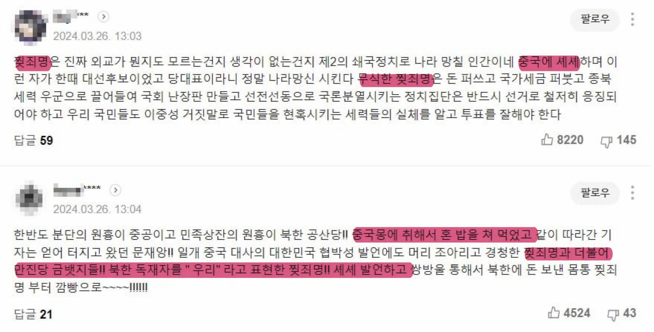 조선일보에서 연일 다루는 이재명 대표 발언의 핵심은 우리나라가 굳이 ‘양안 문제’에 개입할 필요없이 국익과 실리를 챙겨 중립을 지키자는 취지였다. 그런데 조선일보는 인사말에 불과한 단어 하나로 ‘이재명 악마화 사골국’을 끓여 ‘친중’이라고 호도한다. 그것도 모자랐는지 혐오 댓글 불판을 유도하는 듯한 아래 그림과 같은 기사를 집요하게 생산하는 중이다. 최근 중국 수출이 증가했다는 소식이 무색하게 교역국을 적대시하여 혐오를 부추기는 조선일보의 이런 보도 방식은 이해하기 어렵다.
